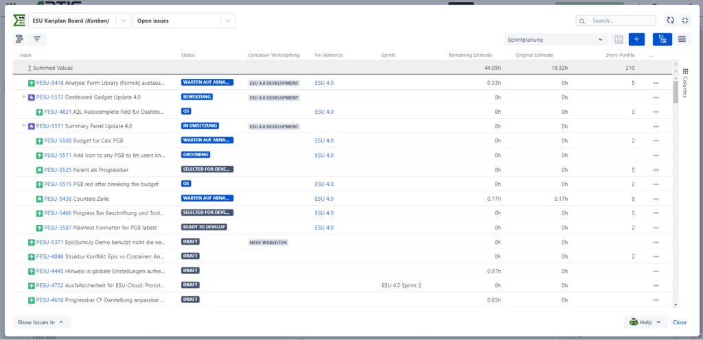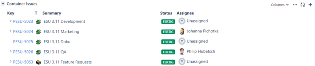 In the course of ESU development, we rely on Containers and Versions. The latter are for Stories, bugs and features – a method we’ve chosen to allow ourselves to utilise Jira’s features. The Containers, on the other hand, are for tasks other than Developers’ stories.