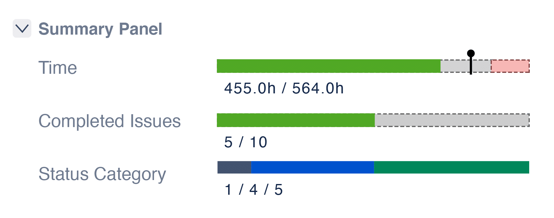 Summary Panel with Time, Completed Issues and Status Category appears in every epic thanks to Epic Sum Up. They have been critical to the improvement in estimating.