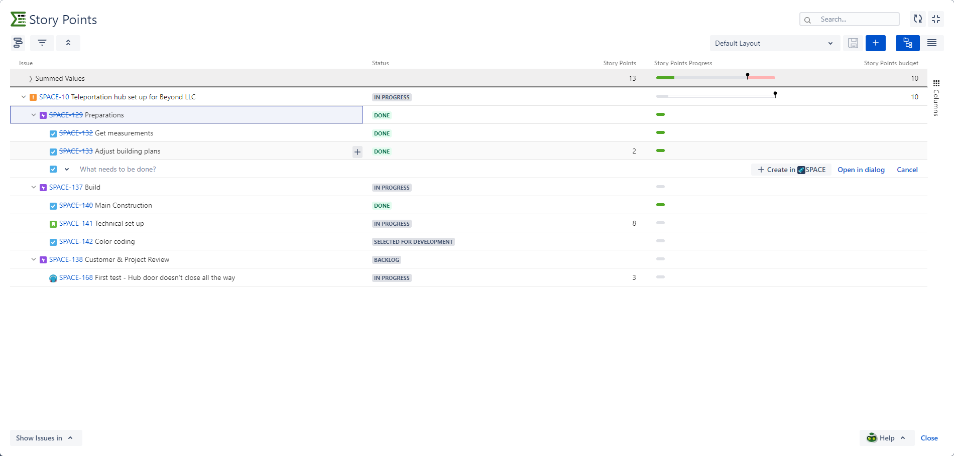 Our main multipurpose tool within Epic Sum Up is the Detail View Editor. It can display your projects – and entire hierarchies – with key metrics for each issue as well as summed up in the summary row. Check out the handy, color-coded progress bar.