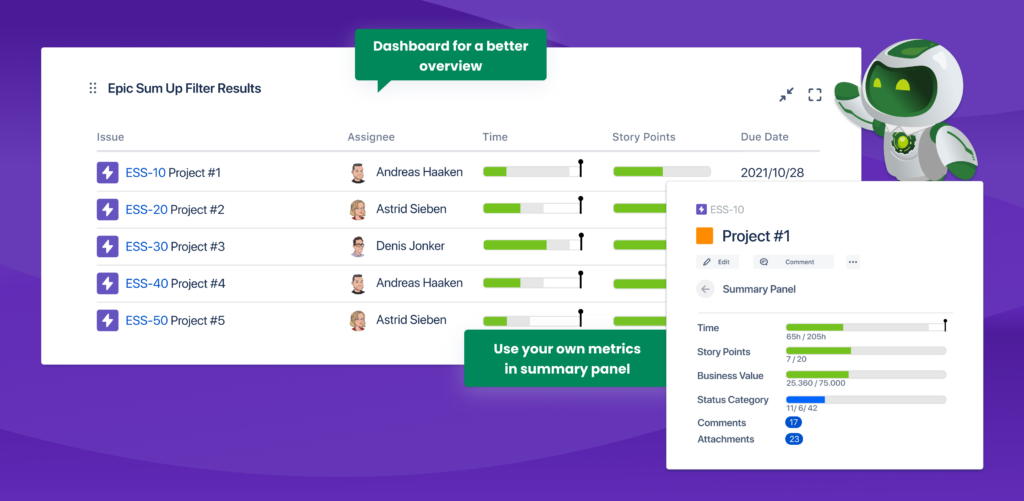 Epic Sum Up is a Jira add-on that brings compelling progress bars and quick summaries for epics, containers, and issues in Jira. It’s a fantastically lightweight option for reporting, but also a great dashboarding option for busy Project Managers that need to see everything at once. Managers can set custom metrics and fields so the sum up is completely unique to what you need to see. With Epic Sum Up, buried data and cluttered quantities become visual, and therefore easy to navigate.